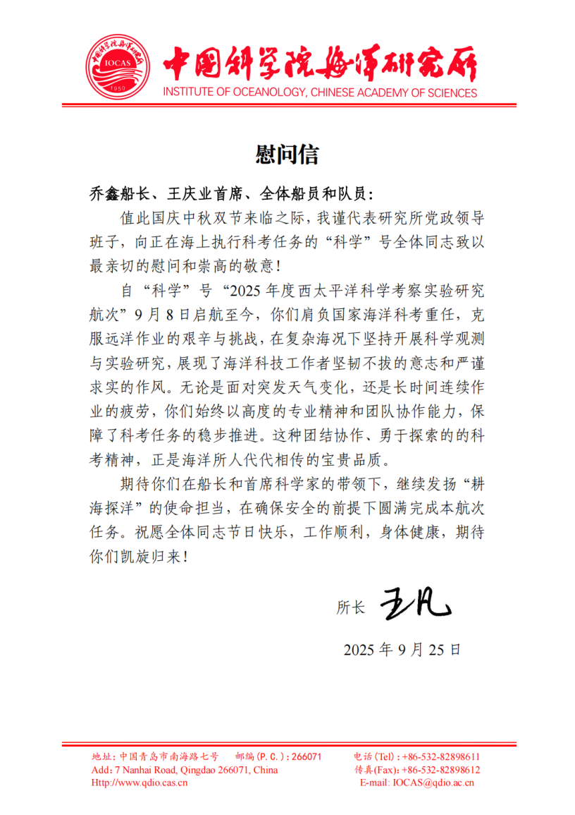 國慶前夕,海洋所所長王凡代表所黨政領導班子致慰問信,對正在西太平洋海域執(zhí)行科考任務的“科學”輪全體同志表達國慶、中秋雙節(jié)的祝福和對克服艱辛、堅守崗位的敬意。