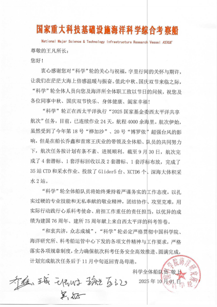 10月1日,“科學”輪船長喬鑫、首席科學家王慶業(yè)等代表全體船隊員回信,表達了收到慰問信的鼓舞與振奮,匯報了截至目前的航次工作進展,并向海洋所全體職工致以節(jié)日的問候。船隊員們表示,“科學”輪將嚴格貫徹中國科學院、海洋研究所、科考船運管中心的各項文件精神和工作要求,團結(jié)協(xié)作,攻堅克難,圓滿完成航次科考任務,以優(yōu)異成績?yōu)樾轮袊闪?6周年、建所75周年獻上科考答卷。