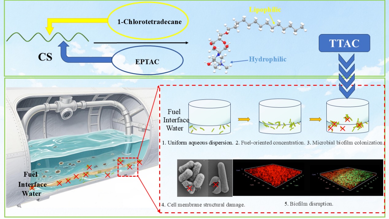 近日,中國(guó)科學(xué)院海洋研究所海藻化學(xué)與海洋藥物組首次構(gòu)建多糖基雙效協(xié)同抗菌劑,成功開發(fā)新型廣譜抗菌劑苯并異噻唑啉酮季銨化殼聚糖(HACCBIT)和油水界面生物膜定向抗菌劑N-羥丙基三甲銨-O-烷基殼聚糖(TTAC)。該成果突破航空燃油系統(tǒng)微生物污染與協(xié)同防控的技術(shù)瓶頸,相關(guān)研究先后于5月15日和10月7日發(fā)表在學(xué)術(shù)期刊Carbohydrate Polymers(影響因子12.5)和Chemical Engineering Journal(影響因子13.2)。