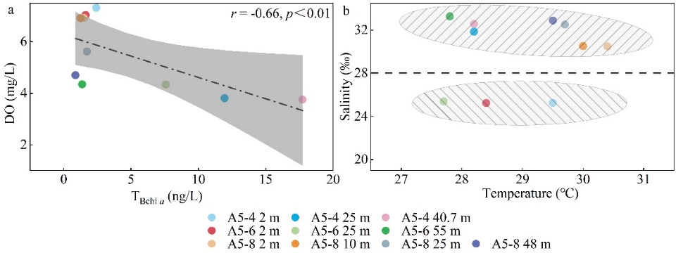 a.水體中Bchls與溶解氧(DO)的相關(guān)關(guān)系,陰影區(qū)域?yàn)?5%置信區(qū)間;b. 基于溫度和鹽度數(shù)據(jù)的長江口水體分層狀況。
