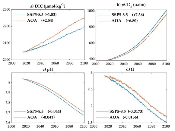 圖2. 高排放情境下全球平均(a) DIC, (b) pCO2, (c) pH和(d) Ω在本世紀(jì)的演變