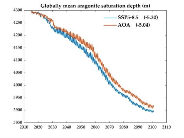圖5. 高排放情境下本世紀(jì)全球平均飽和Ω最低水深(即高于此深度后Ω將不飽和)的變化