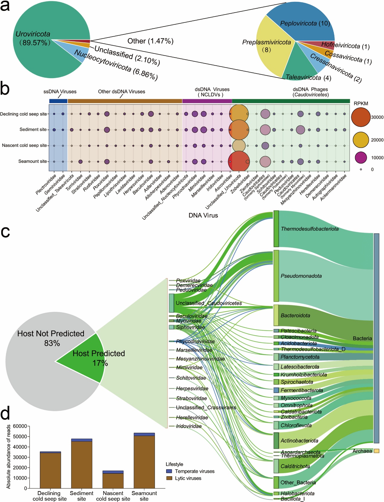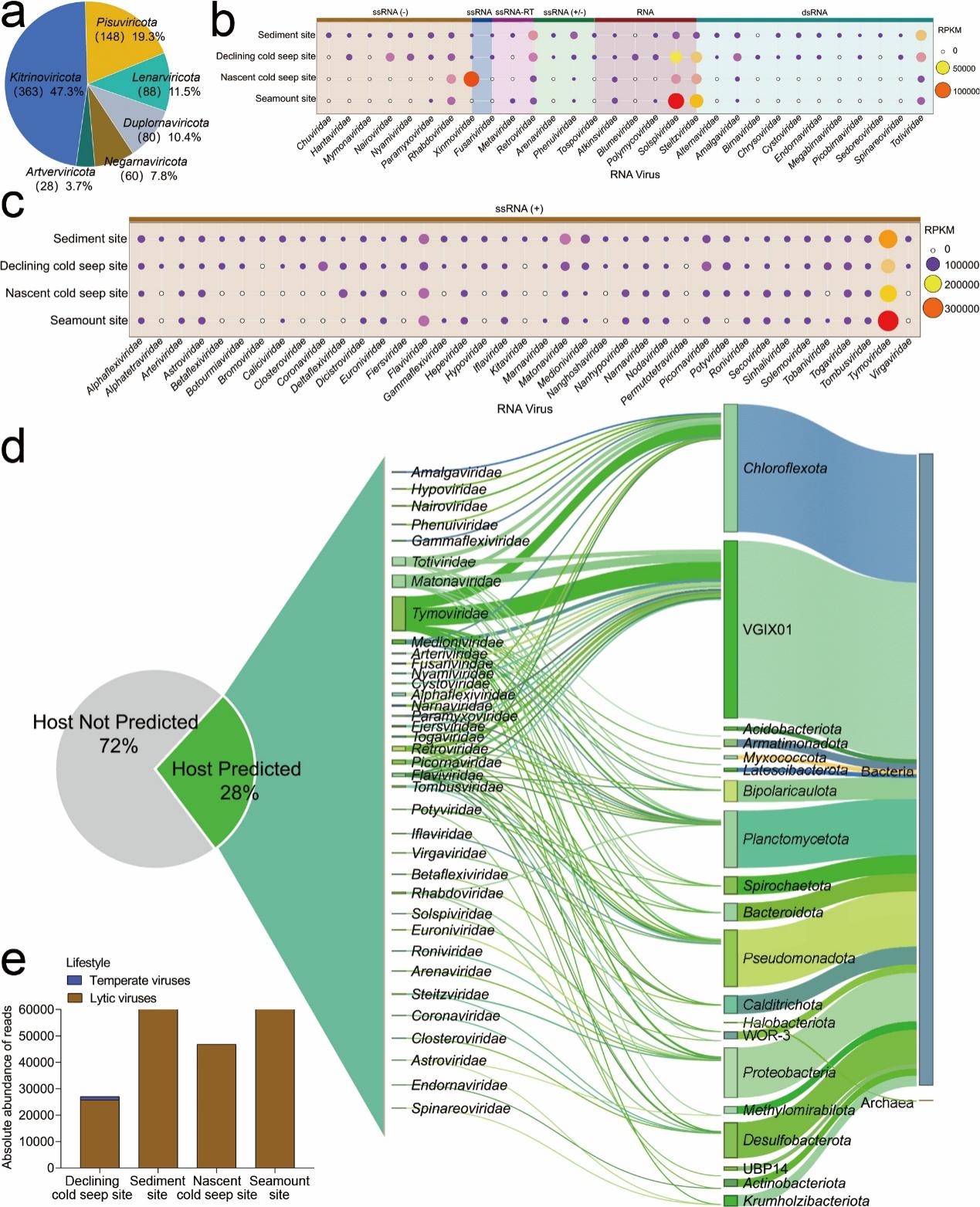 研究團(tuán)隊(duì)選擇了四個(gè)樣品采集點(diǎn),包括正在衰減的冷泉、遠(yuǎn)離正在衰減冷泉的地點(diǎn)、新生冷泉和海山。獲取上述四個(gè)采集點(diǎn)的沉積物后,綜合利用宏基因組學(xué)、DNA和RNA宏病毒組學(xué)、宏轉(zhuǎn)錄組學(xué)等多組學(xué)技術(shù),結(jié)合純化病毒群落的表征,對(duì)不同深海沉積物的病毒群落和功能進(jìn)行了深入研究。深海沉積物的病毒提取和宏病毒組學(xué)分析顯示,深海沉積物中存在著多種多樣的病毒形態(tài)(圖1),包括大量DNA和RNA病毒,且有很大一部分是先前未被描述的病毒譜系。深海RNA病毒群落與DNA病毒群落相比,在宿主偏好和生活方式上表現(xiàn)出顯著差異,尤其在新生冷泉中,RNA病毒的相對(duì)稀少和缺乏溫和性噬菌體預(yù)示著不同的能量流動(dòng)模式(圖2)。雖然Tymoviridae等RNA病毒在深海沉積物中普遍存在,但新生冷泉特有的Xinmoviridae(感染真核生物)的富集,提示深海病毒多樣性研究仍需進(jìn)一步探索其真核宿主的作用(圖3)。病毒基因組和宏轉(zhuǎn)錄組的分析表明,病毒中的功能基因在原位環(huán)境中處于較高表達(dá)水平,這也是其增強(qiáng)宿主代謝復(fù)雜有機(jī)物能力的有力證據(jù)。研究成果強(qiáng)調(diào)了不同冷泉和海山中病毒群落的多樣性、生態(tài)作用和宿主相互作用,表明病毒在深海碳循環(huán)和微生物群落結(jié)構(gòu)中的重要性。