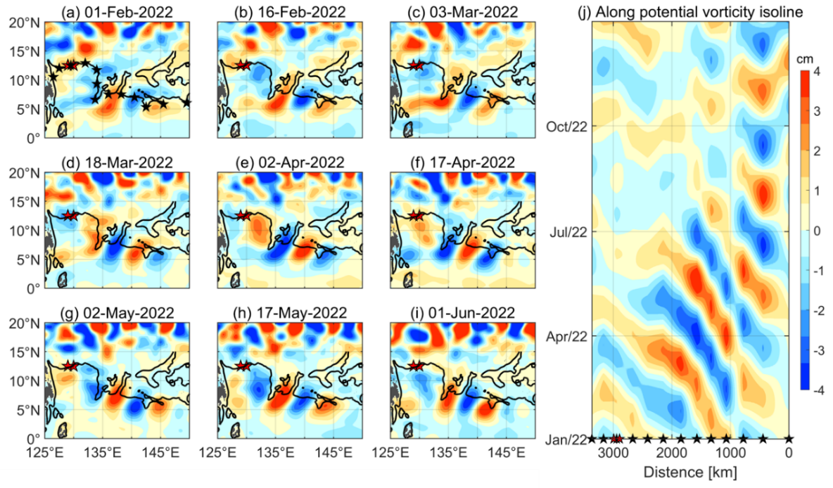 圖2(a-i)2022年2月1日至2022年6月1日帶通SLA水平場(chǎng)。黑色等值線表示5.5×10-9 m-1 s-1等位渦線。(j)帶通SLA沿5.5×10-9 m-1 s-1等位渦線的Hovm?ller圖。橫坐標(biāo)表示從(a)中最東側(cè)黑色五角星開始計(jì)算的黑色五角星所對(duì)應(yīng)的距離。(a-j)中紅色五角星表示潛標(biāo)位置。