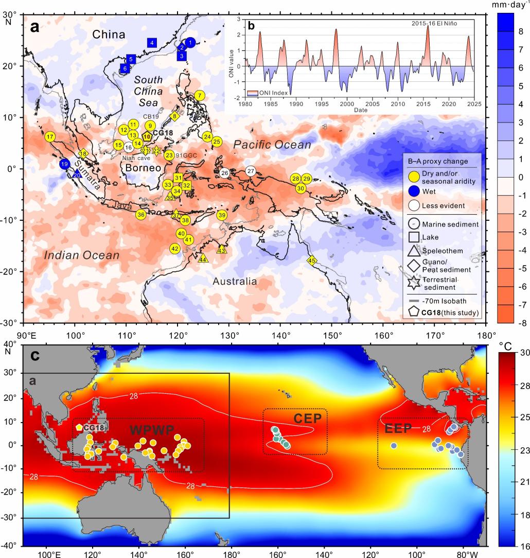 末次冰期氣候存在千年尺度的D–O振蕩,其冷階段常與北大西洋冰筏碎屑事件對應。研究表明,這些事件可通過大西洋經(jīng)向翻轉環(huán)流影響東亞冬季風與熱帶輻合帶,相關信號已在西太平洋與東南亞的氣候記錄中識別。然而,當前熱帶西太平洋地區(qū)缺乏高分辨率沉積記錄,難以系統(tǒng)評估其在D–O暖階段—可作為全球快速增溫期氣候響應的關鍵類比—的氣候反饋與遙相關機制。同時,作為全球年際氣候變率主控因子的ENSO,其古氣候重建多局限于全新世與末次盛冰期,在更早的D–O旋回中捕捉ENSO相關水文氣候變率的高分辨率記錄極為稀缺,限制了對其長期演化及對快速氣候變化響應的理解。