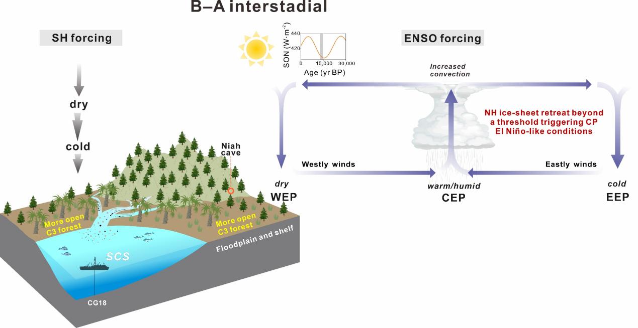 研究進一步揭示,B?lling–Aller?d暖期西太平洋的干旱由ENSO與南半球強迫共同驅動。末次冰消期熱帶大氣受軌道輻射冷卻影響,首先在赤道西太平洋激發(fā)西風異常;隨著北半球冰蓋消融越過關鍵閾值,觸發(fā)類中太平洋型厄爾尼諾狀態(tài),導致沃克環(huán)流上升支東移,進一步強化西風異常并形成正反饋。與此同時,南半球強迫加劇西太平洋的區(qū)域冷卻與下沉氣流,抑制深對流從而促進干旱;此大氣調整亦使熱帶輻合帶持續(xù)北縮,導致中國南方及臺灣地區(qū)降水梯度顯著增強。