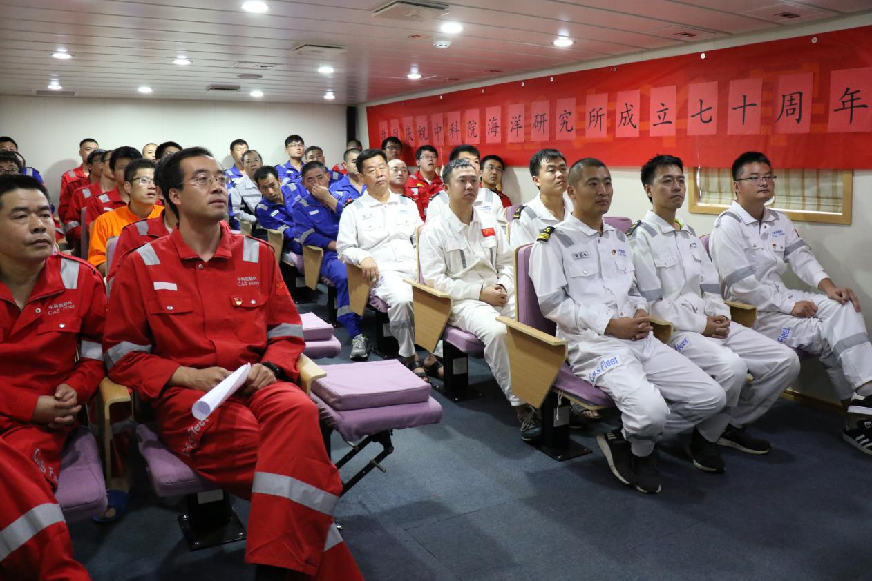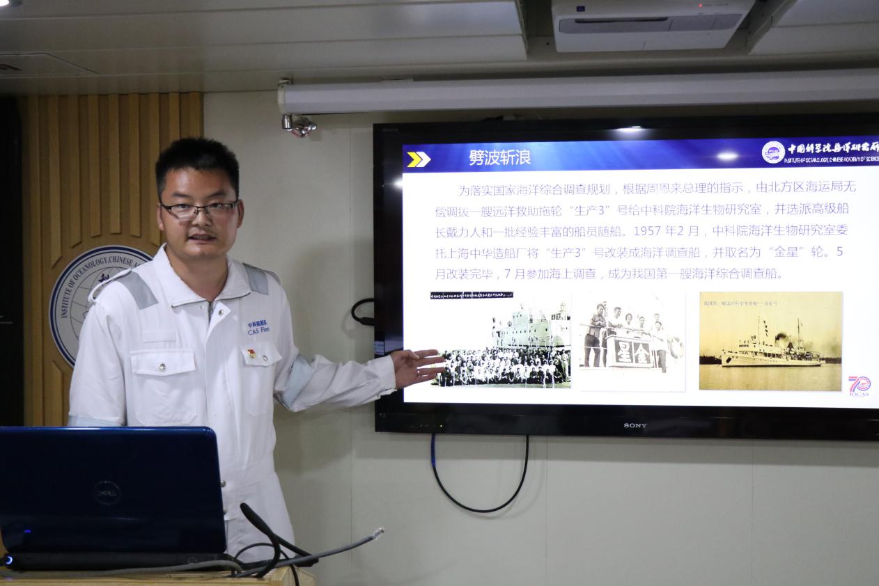 8月1日上午海洋研究所舉行慶祝成立70周年紀(jì)念活動(dòng),“科學(xué)”號(hào)全體人員與所里慶?;顒?dòng)進(jìn)行直播連線。下午,結(jié)合海洋所建所70年來海洋考察情況,“海上堡壘”臨時(shí)黨支部委員梁喜祥同志做了主題為“《劈波斬浪七十載,櫛風(fēng)沐雨創(chuàng)輝煌》海洋所船隊(duì)七十年發(fā)展歷史”的專題講座。講座通過珍貴的歷史照片介紹了建所以來科考船隊(duì)伴隨著海洋所一步步成長(zhǎng)的過程,介紹了從“金星”輪到“科學(xué)一號(hào)”輪再到“科學(xué)”輪等20余條海洋調(diào)查船的資料、各時(shí)期海上考察生活工作情況,以及各科考船在當(dāng)時(shí)取得的一系列重大科研成果及獲得的榮譽(yù)。講座還介紹了科考船隊(duì)在新時(shí)代承擔(dān)與國外交流合作的情況及近些年進(jìn)行的科普教育情況。通過一張張珍貴照片,與會(huì)人員了解到老一代海洋所船隊(duì)員劈波斬浪的奮斗史,也熟悉了新時(shí)代海洋所船隊(duì)員開拓創(chuàng)新的拼搏史。最后大家觀看了“科學(xué)”輪為慶祝海洋所成立70周年制作的短片。