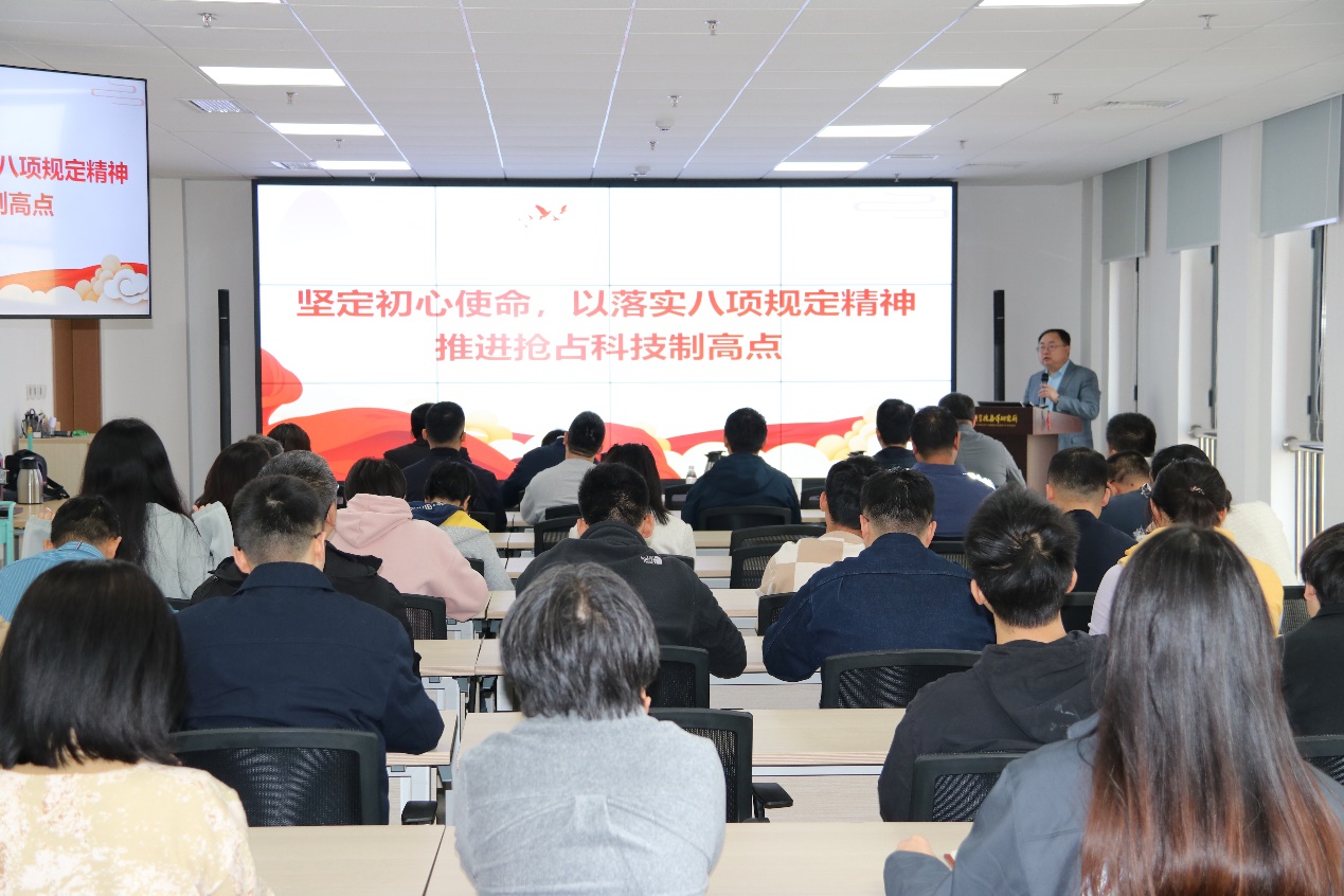 王凡所長以“堅定初心使命,以落實八項規(guī)定精神推進搶占科技制高點”為題做黨課報告,圍繞習近平總書記中央八項規(guī)定重要論述、關于中央八項規(guī)定和中央八項規(guī)定精神、院黨組深入貫徹中央八項規(guī)定精神學習教育的實施方案等三個方面展開深度解讀。他指出,開展深入貫徹中央八項規(guī)定精神學習教育,是鞏固深化主題教育和黨紀學習教育成果、縱深推進全面從嚴治黨的重要舉措,是密切黨群干群關系、鞏固黨的執(zhí)政基礎的必然要求,是推進中國式現(xiàn)代化的有力保障。要以“學精神、強作風、促攻堅”為主線,堅持將學習教育同搶占科技制高點核心任務結合起來,同深入推進黨風廉政建設和反腐敗斗爭結合起來,同深入開展“深化黨紀學習教育、嚴明崗位工作紀律”專項工作結合起來,同強化作風學風、加強新時代創(chuàng)新文化建設結合起來,聚焦主題、簡約務實、不分批次、不劃階段,一體推進學查改,融入日常、抓在經(jīng)常。