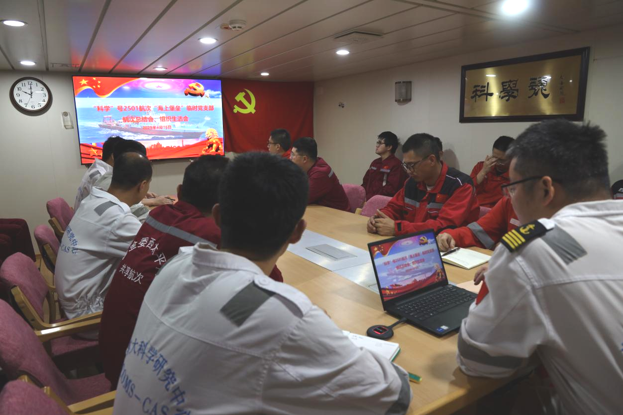 4月16日,執(zhí)行基金委西太平洋共享航次的“科學”輪2501航次“海上堡壘”臨時黨支部召開航次總結(jié)會。會議由臨時黨支部書記、船長梁喜祥主持,支部全體黨員、預備黨員參加會議,民盟盟員、首席科學家張祥光列席會議。