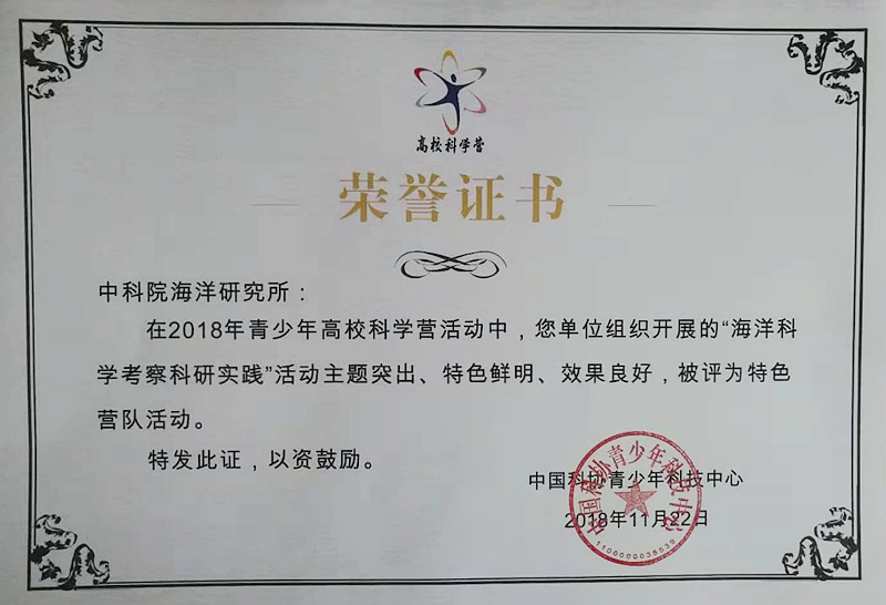 海洋所在2018年青少年高??茖W(xué)營活動(dòng)中獲多項(xiàng)表彰