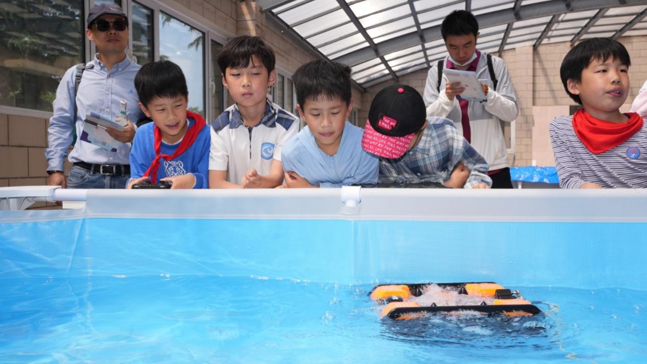 水下機(jī)器人操作互動(dòng)區(qū)吸引了眾多家長(zhǎng)和孩子參與。在科研人員指導(dǎo)下,孩子們通過(guò)操縱桿實(shí)時(shí)調(diào)控水下機(jī)器人的推進(jìn)器功率,完成定深懸停、障礙避讓等指令,同步觀察攝像頭傳回的水下實(shí)時(shí)畫(huà)面,在工程思維與海洋科技的碰撞中,培育青少年“手腦聯(lián)動(dòng)”的創(chuàng)新能力。